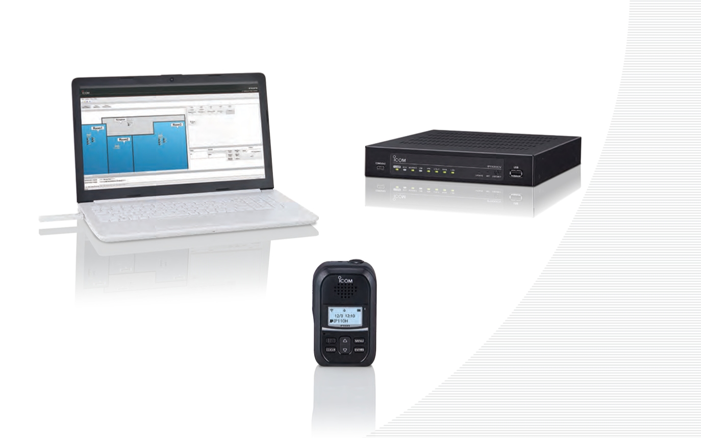 IP1100CV 最多可註冊 300 個 Wi-Fi 無線電裝置(包括 IP100FS 終端)。安裝 IP100FS Wi-Fi 無線電應用軟體後,您可以使用 Windows ® PC 與手持式 Wi-Fi 無線電 IP110H/IP100H 進行通訊。
