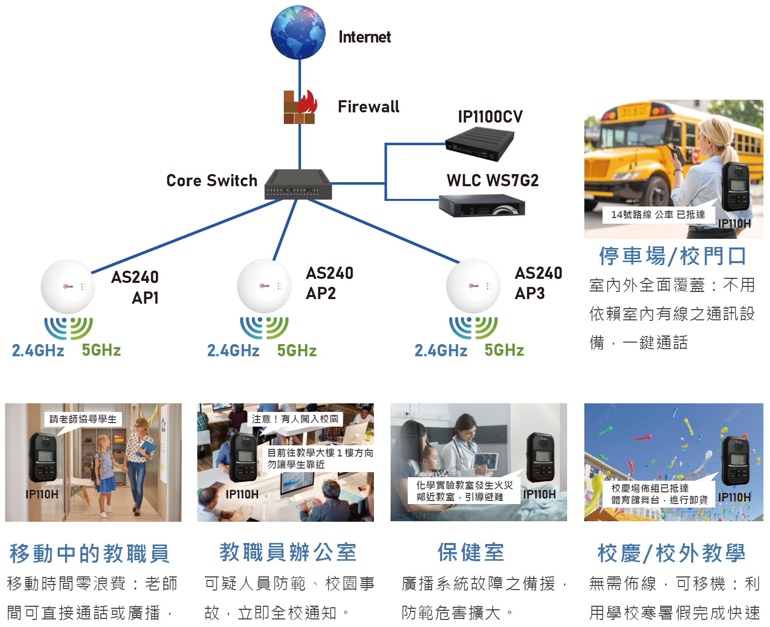 IP1100CV 是 IP110H/IP100H Wi-Fi 無線電台的系統控制器,可透過 Wi-Fi 網路進行通訊。只需在網路中安裝一個控制器,並在不同位置部署 Wi-Fi 接入點,即可建置通訊網路。